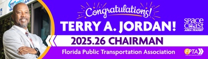 Space Coast Area Transit Director, Terry Jordan, was elected as Chairman of the Florida Public Transportation Association (FPTA) for 2025/26. FPTA represents 40 urban and rural transit systems, including commuter railroads, a heavy-rail commuter system, and people mover systems. Collectively, these systems carry 132 million passengers annually, with a fixed-route operating budget of $1.44 billion.